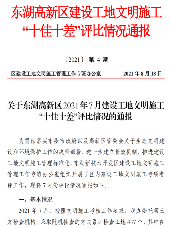 ? 根據(jù)東湖新技術(shù)開發(fā)區(qū)建設(shè)工地文明施工管理工作專班辦公室組織開展的區(qū)內(nèi)建設(shè)工地文明施工專項考評,之寓未來(武漢未來科技城青年社區(qū))項目被評為2021年7月東湖高新區(qū)文明施工“十佳”工地。